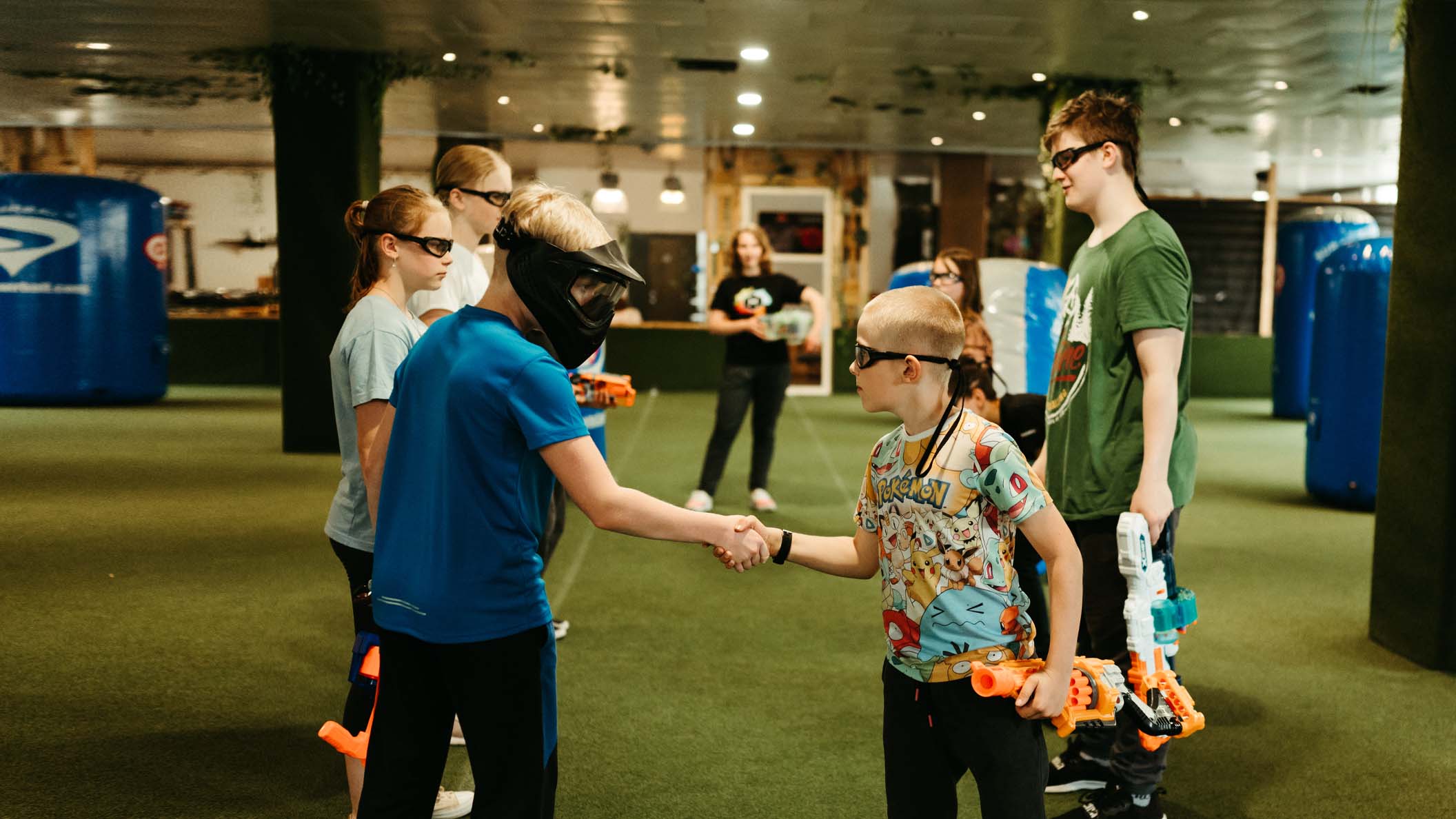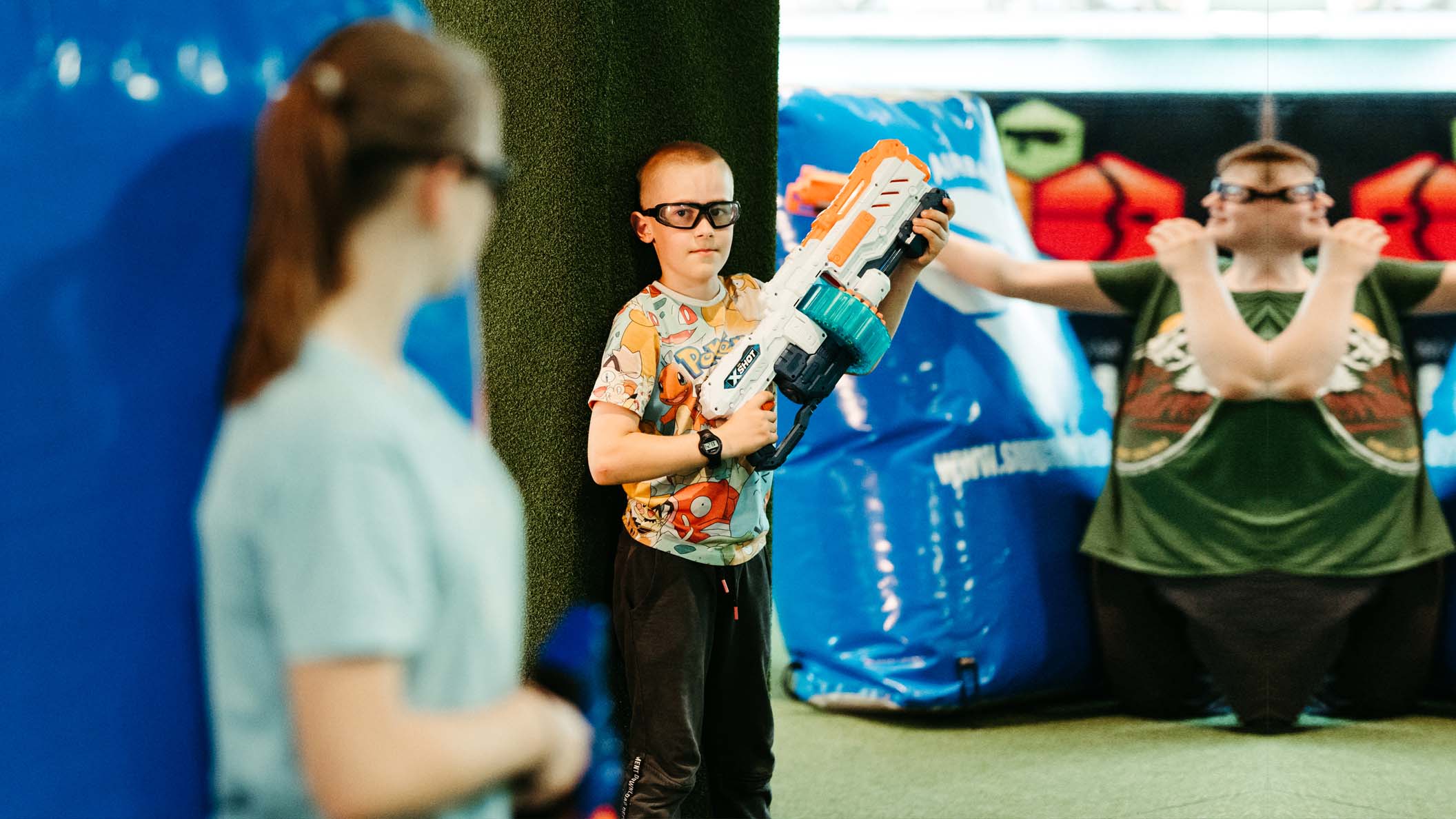 Nerf aréna to je speciální vnitřní hříště s umělým trávníkem, nafukovacími překážkami na 330 m2 a taky příjemné posezení s výhledem na probíhající bitvu, kde mohou rodiče své ratolesti pozorovat, občerstvit se a odpočívat, nebo si klidně zahrát také. Díky ochranným brýlím a pěnovým šipkám je Nerf aréna naprosto bezpečná zábava pro děti. Vše ti s nadšením ukáže a vysvětlí náš zkušený personál, který bude po celou dobu s hráči. Tento prostor je naprosto ideální pro dětské narozeninové oslavy.